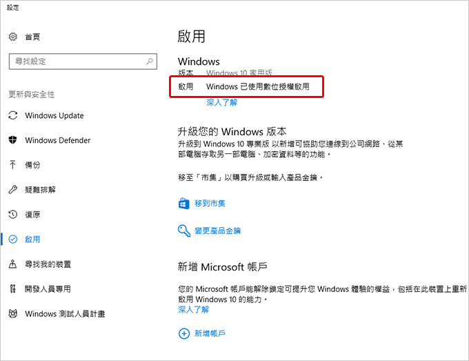 10.接著在左邊的功能選單選擇啟用,由於剛才我們進行過微軟帳號的驗證,這時候啟用狀態應該顯示為「Windows已使用連結到您Microsoft帳號的數位授權啟用」