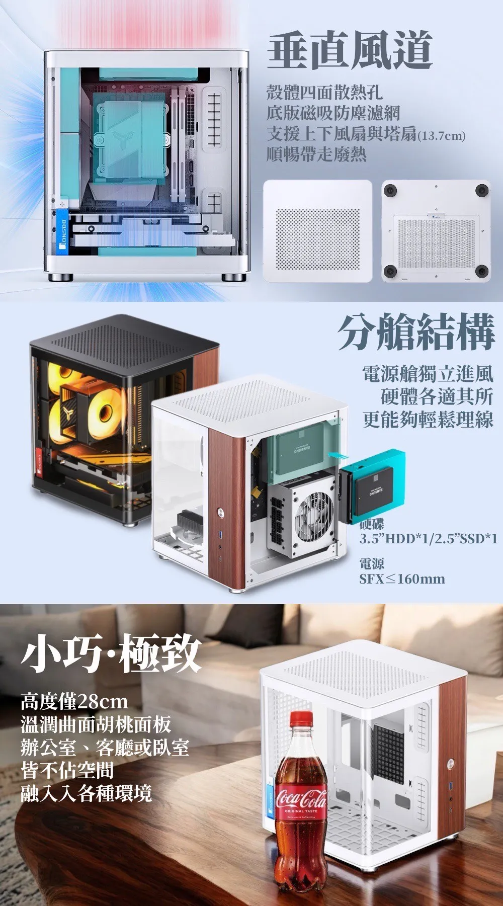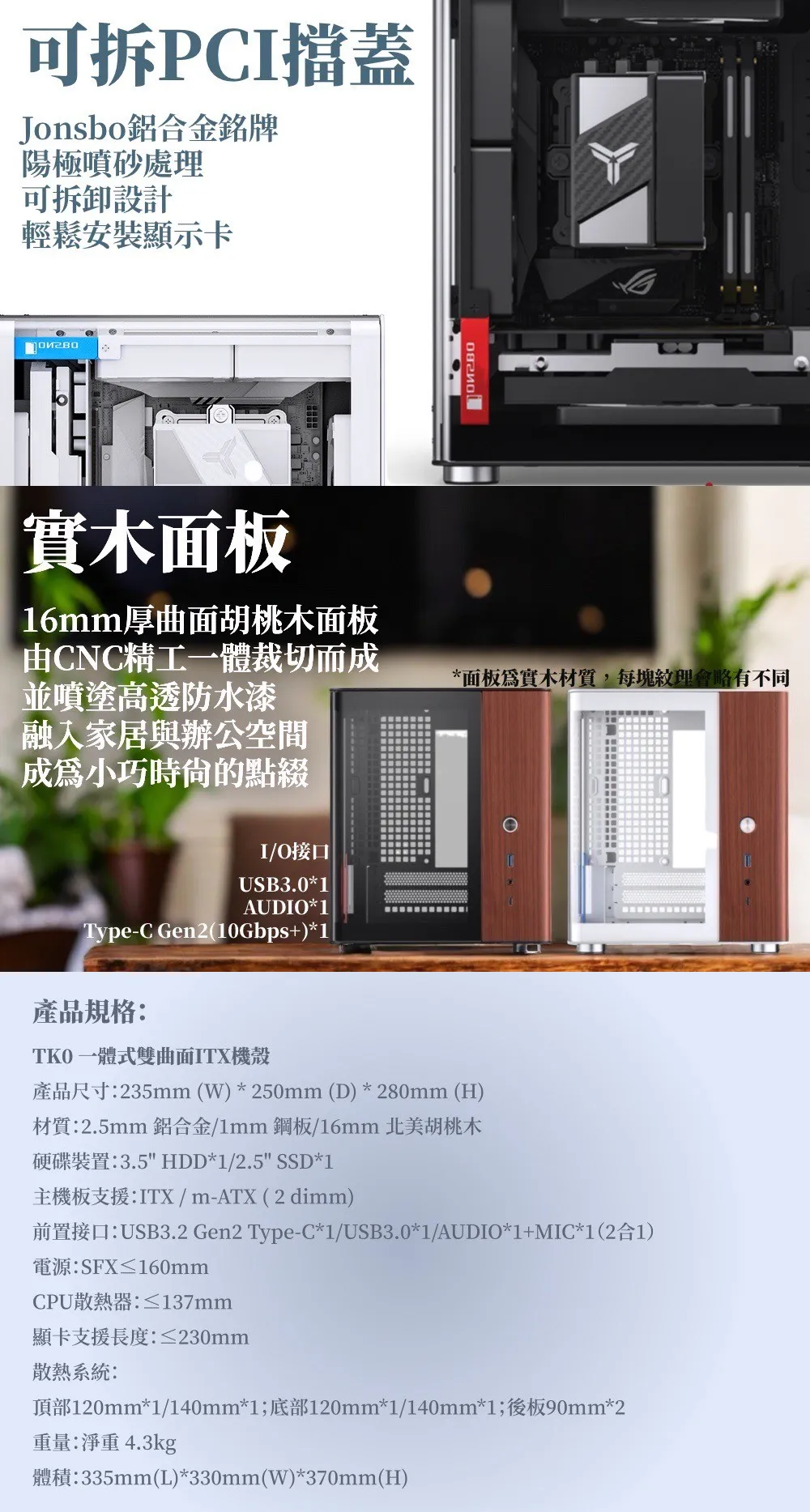 / 06J22031 JONSBO 喬思伯 TK0 ITX 一體式曲面玻璃機殼 黑/白(ITX/Matx-2dimm/胡桃實木/鋁合金/海景/可橫躺/分艙/SFX)