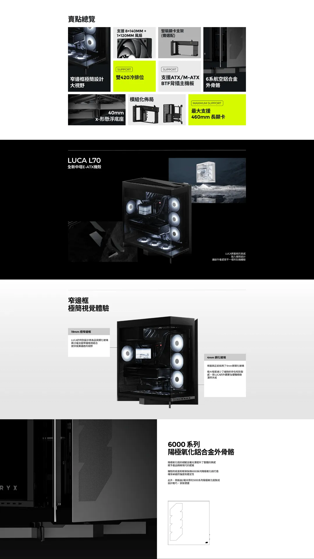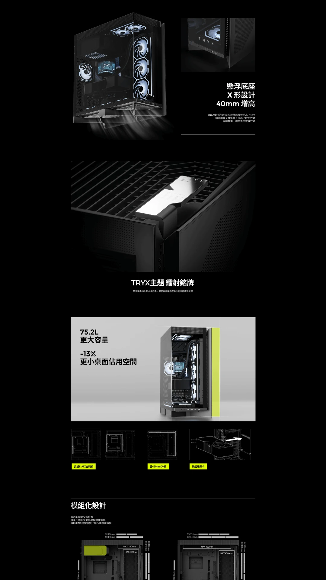 【會員再折 2%】06T72001 TRYX Luca L70 懸浮X型底座 鋁合金海景機殼 黑/白(E-ATX/精品級/背插/雙420/航太級鋁合金)