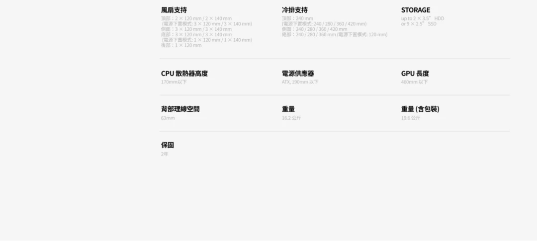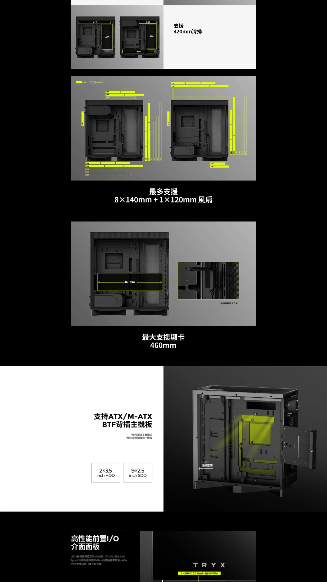 支援雙 420mm 水冷排安裝(頂部與側面),最多可安裝 9 顆 120/140mm 風扇
