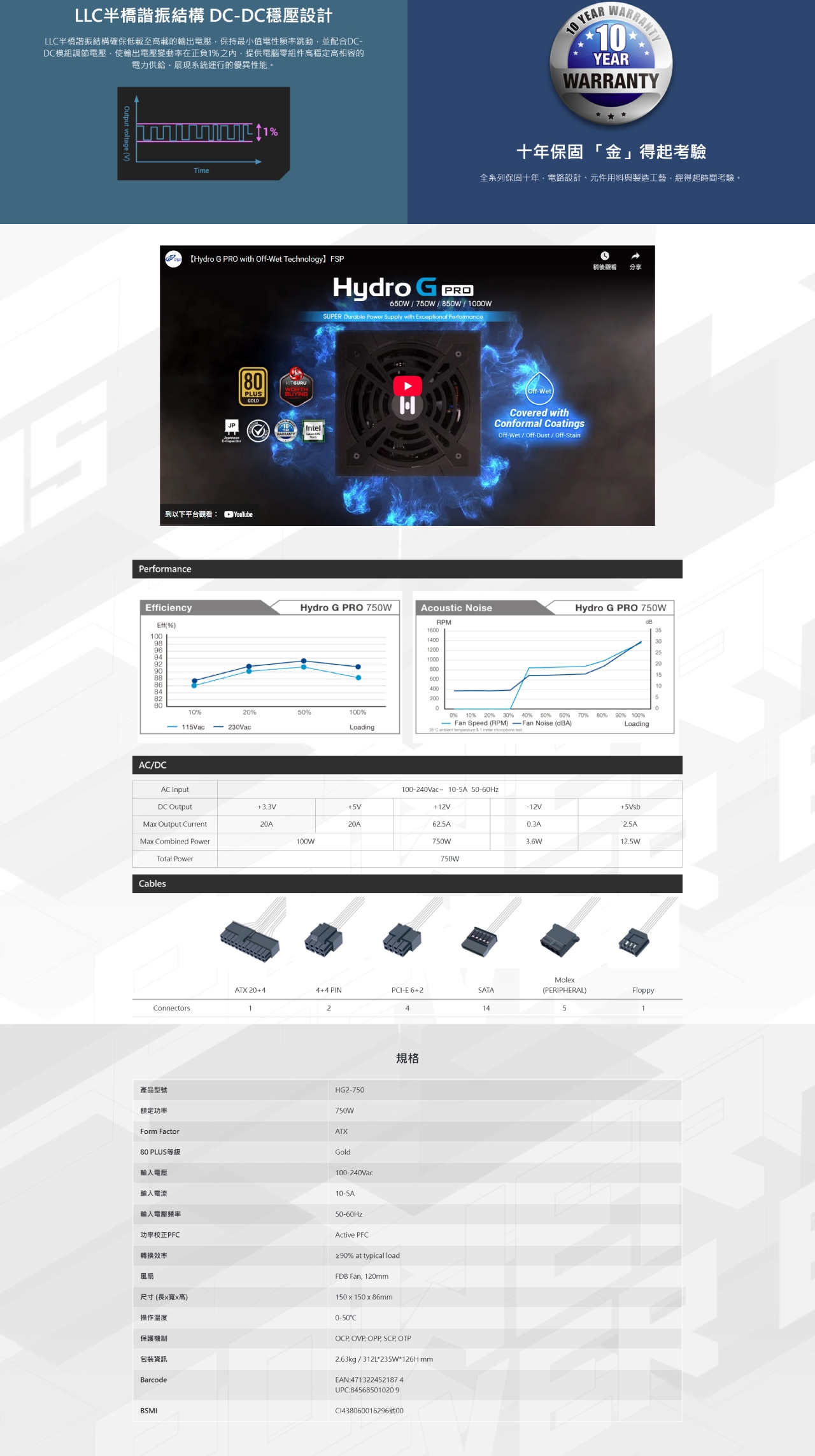 07F17067 FSP 全漢 Hydro G PRO 750W 金牌 電源供應器(全模組/10年保)