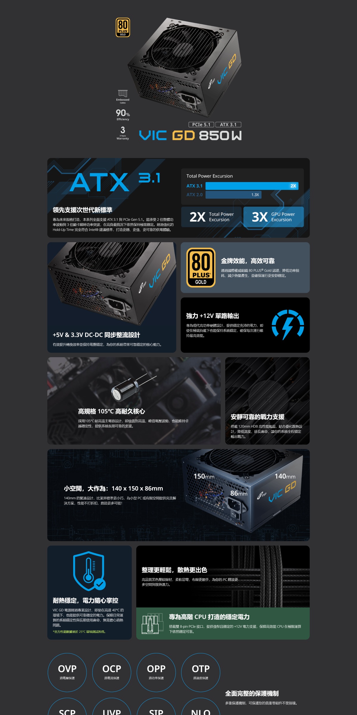 VIC GD 電源經過專業設計,即使在高達 40°C 的環境下,也能提供可靠穩定的電力。保障日常運算的系統穩定性與長期使用壽命,無需擔心過熱問題。