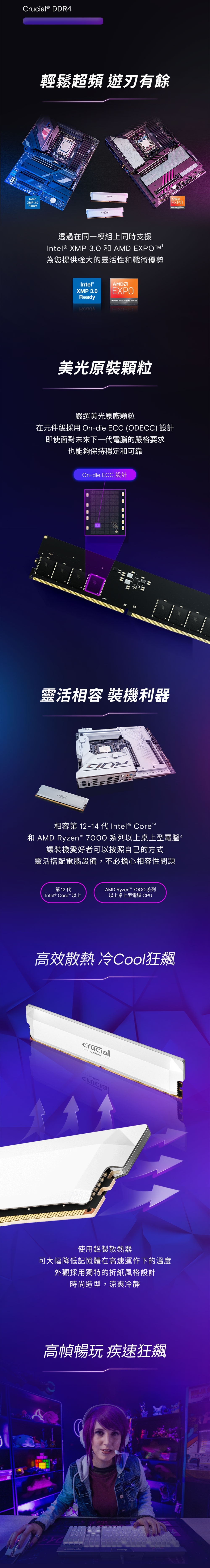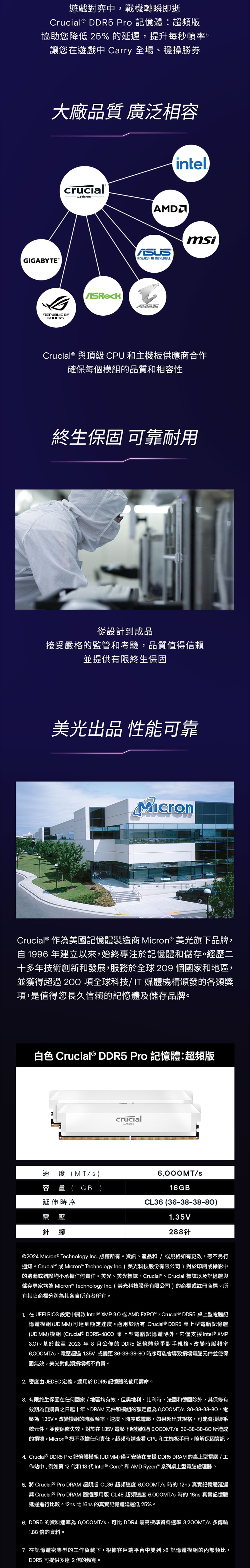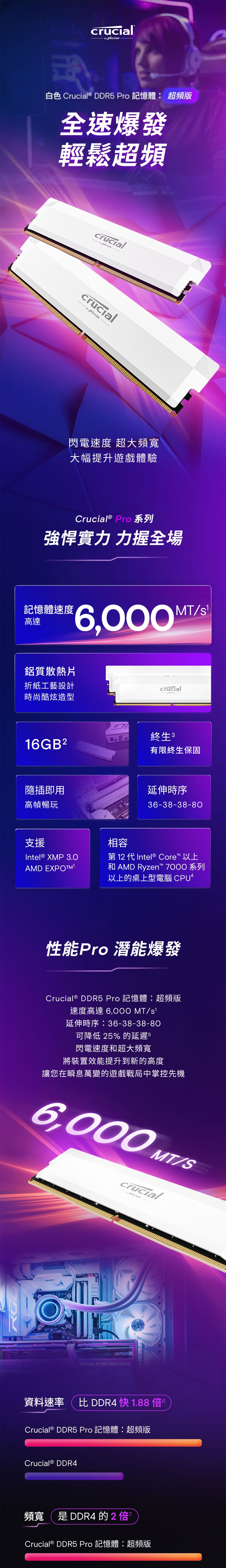 / 10R11094 Micron Crucial 美光 PRO 32GB(16GB*2) DDR5-6000/CL36 桌上型超頻記憶體 白散熱片