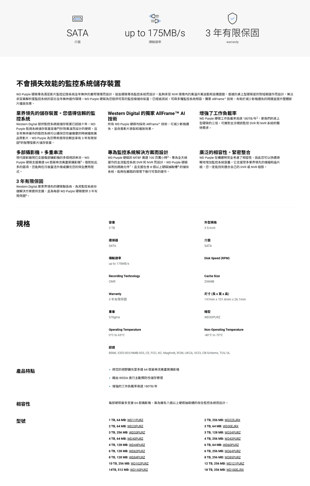 WD Purple 系列硬碟針對監控 DVR/NVR 應用優化,可在高溫、24 小時不間斷錄影環境下持續工作,並減少影像中斷與錄製失真。