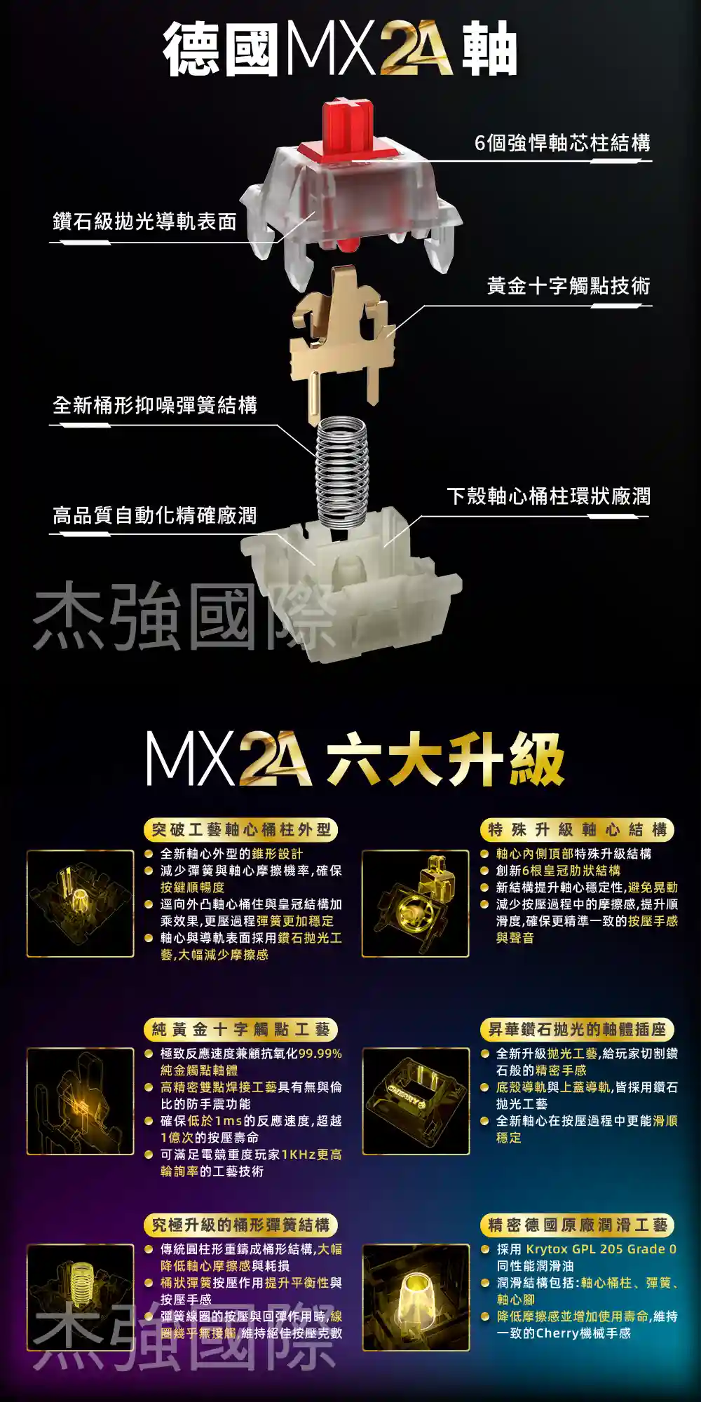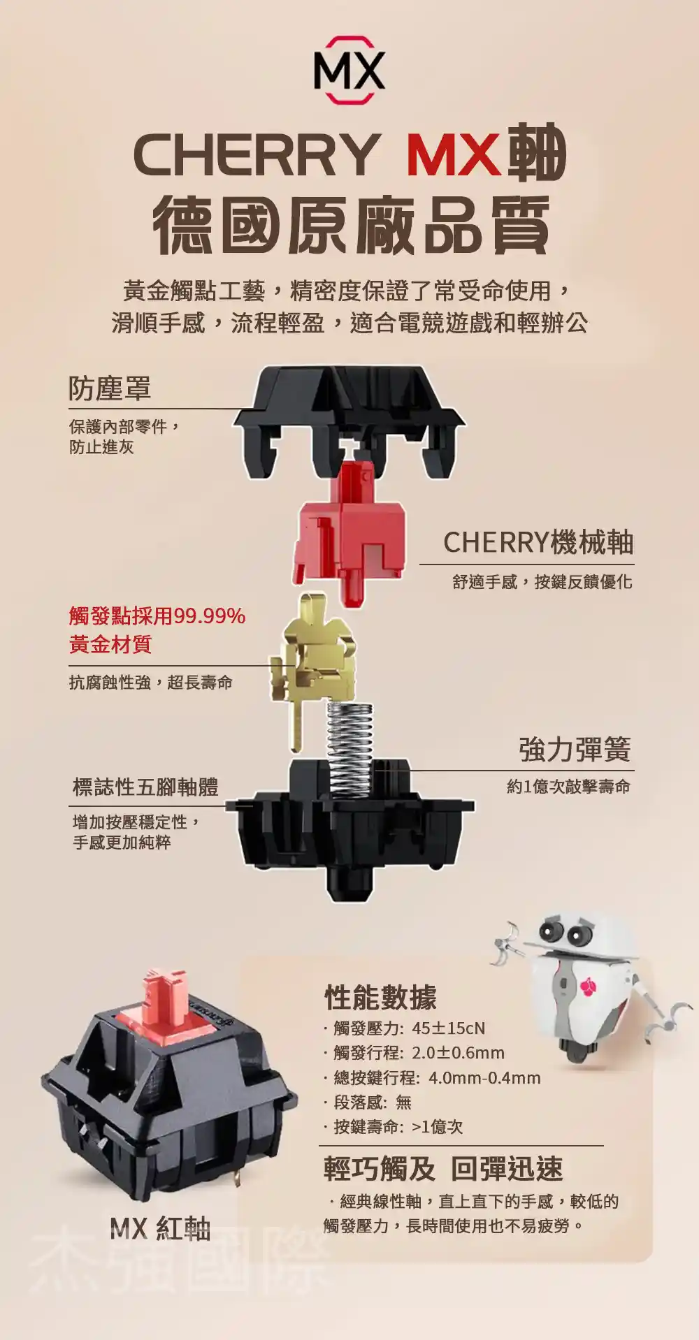 - 低延遲卻有超耐久電力 : 採用 MX2A 軸體與最新觸發晶片,讓反應速率 <1ms 且電力超過200小時。