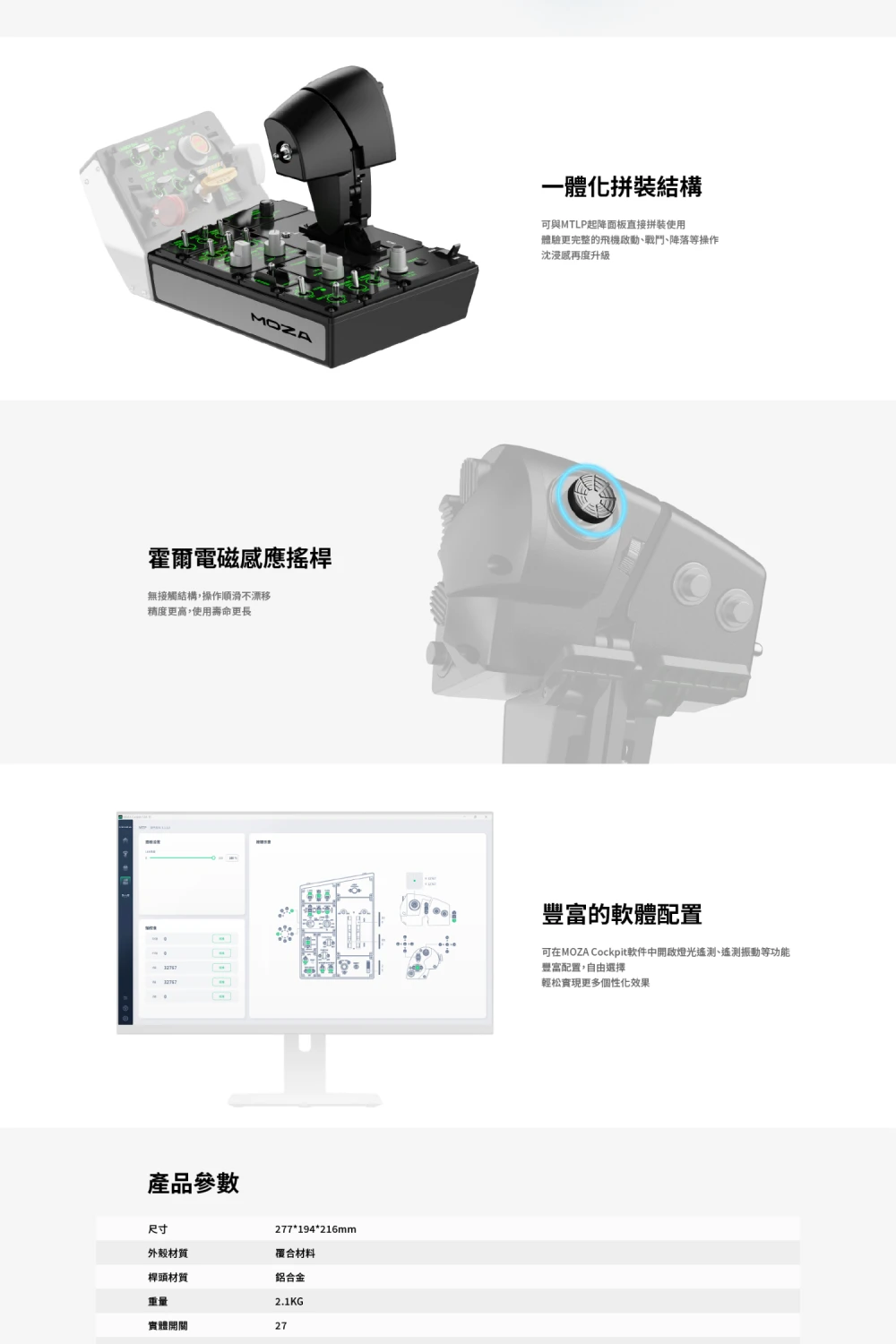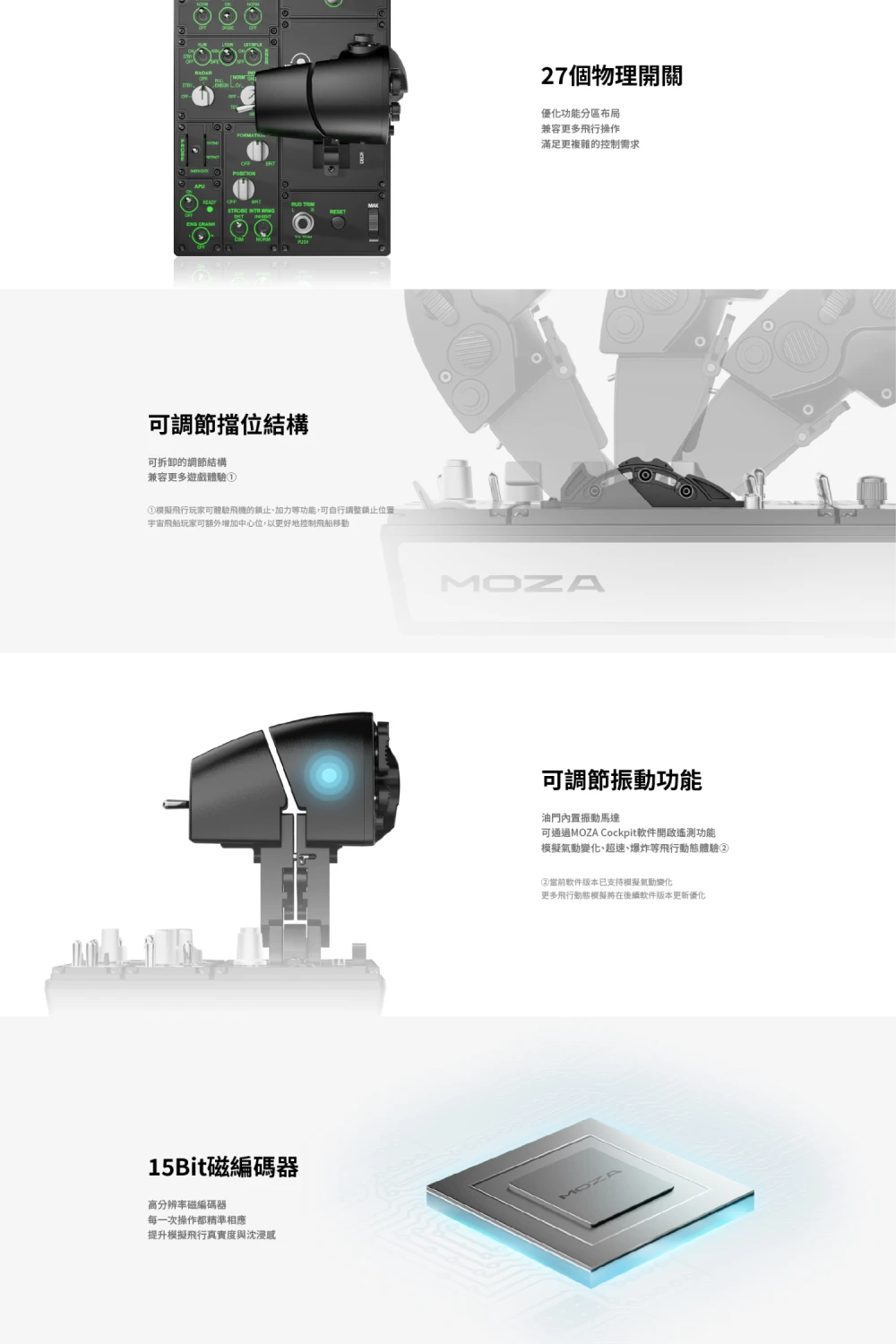 • 可調式振動功能:油門內置振動馬達,可透過 MOZA Cockpit 軟體開啟遙測功能,模擬氣動變化、超速、爆炸等飛行動態體驗
