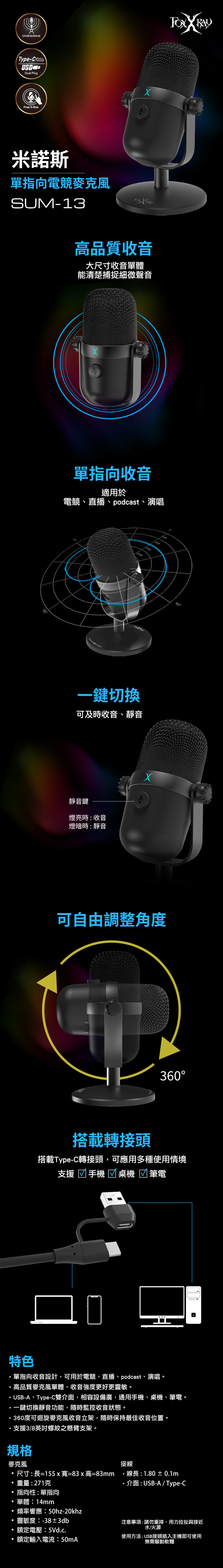 • 單指向收音設計,可用於電競、直播、podcast、演唱。