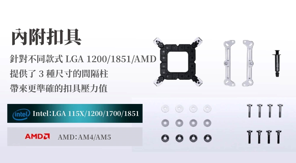 - 內附扣具,針對不同款式 LGA 1200/1851/AMD,提供了 3 種尺寸的間隔柱,帶來更準確的扣具壓力值