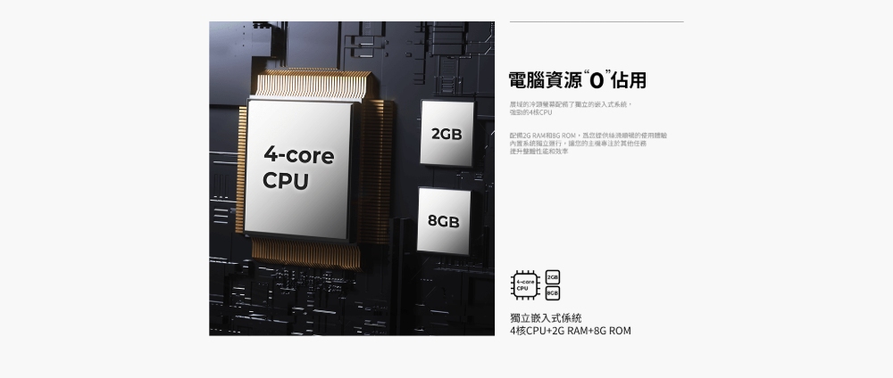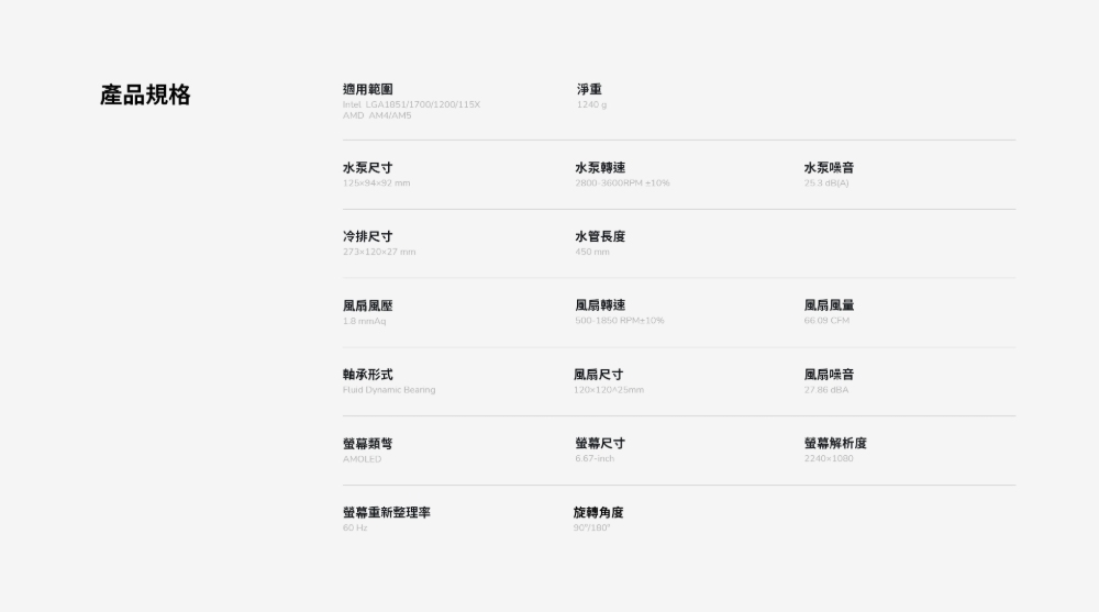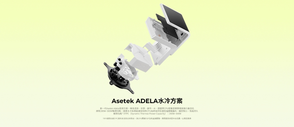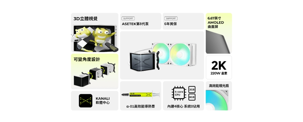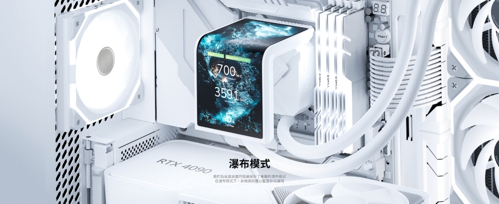 內建 4 核 CPU、2GB RAM、8GB 儲存,降低對主機資源的佔用採用 Asetek Adela 幫浦,轉速範圍 2800~3600 RPM,全速運轉