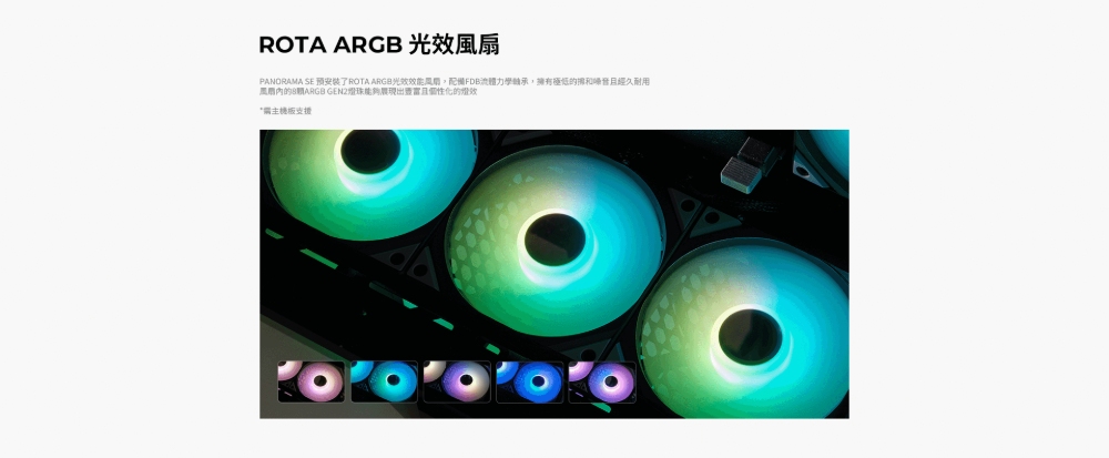 搭載 ROTA ARGB 120mm 風扇,轉速 500~1850 RPM,最大風量 66.09 CFM,最大靜壓 1.8 mmH₂O,最大噪音值 27.86 dB(A)