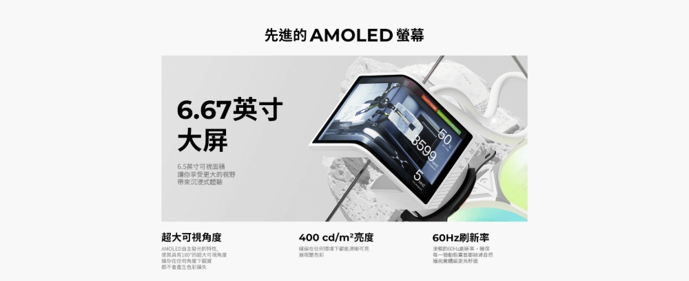 首創 6.5 吋 AMOLED 曲面顯示螢幕,解析度 2240×1080,60Hz 更新率,亮度最高 400nits